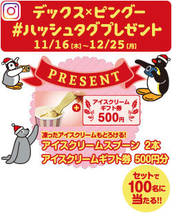 館内で写真を撮影して、「#ピングーラバーズクリスマス」と「#デックス東京ビーチ」を付けてインスタグラムに投稿すると、抽選で合計100名様にアイスクリームギフト券500円分をプレゼントします。