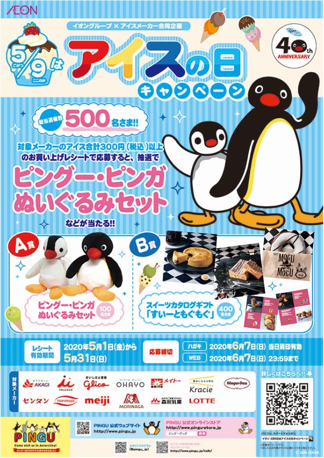 イオングループ対象店舗にて、対象メーカーのアイス合計300円(税込)以上のお買上げで、100名さまに「ピングー・ピンガぬいぐるみセット」が当たるキャンペーンを実施中です♪