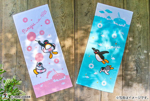 「ピングーロングタオル」は、風船で空に浮んでいる「ピンク」と海で仲良く泳ぐ「ブルー」の2 種、「ピングーハンドタオル」は、浮き輪で遊ぶ「ピンク」と魚釣りを楽しむ「ブルー」の2 種が展開されます。