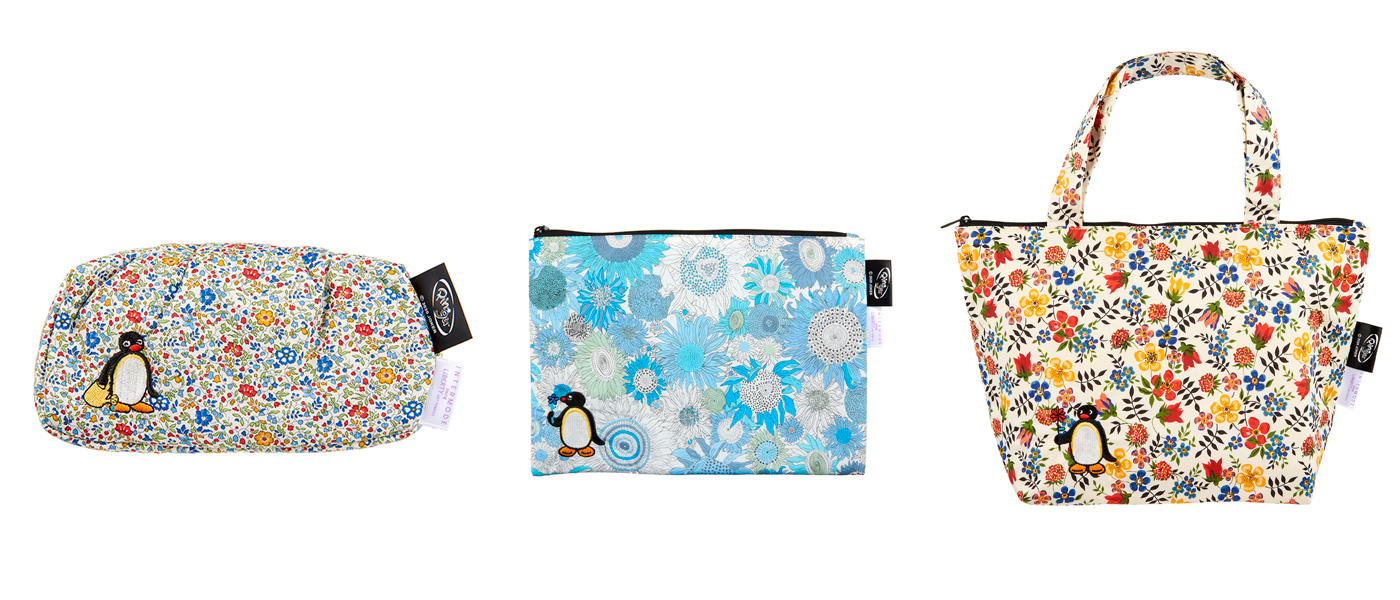 女性に大人気の「リバティプリント」にピングーを刺繍したミニトートバックとポーチが問登場します。