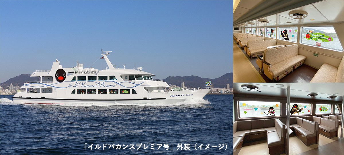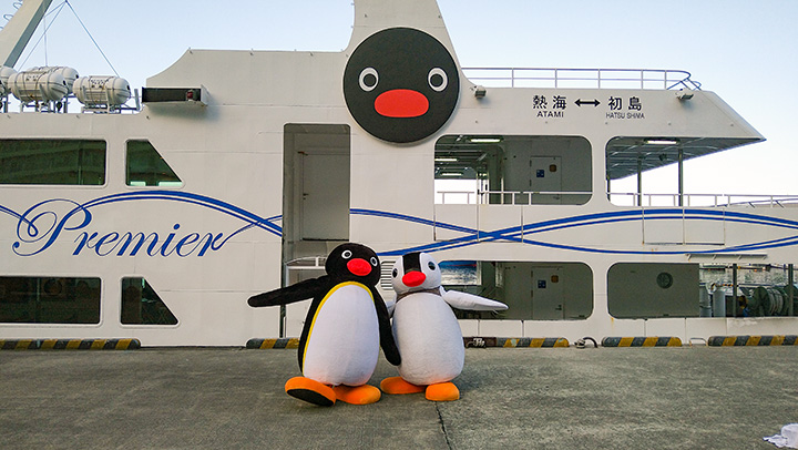 熱海港と離島リゾート「初島」を約30分間で結ぶ定期船「イルドバカンス三世号」と「イルドバカンスプレミア号」がピングーの世界観たっぷりにデコレーションされ、「ピングー号」として運航いたします。ピングーやなかまたちと一緒に優雅な船旅をお楽しみいただけます。